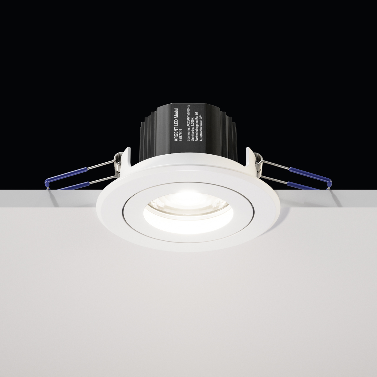 Unser 9W ARGENT Einbaudownlight ist unser Premiumprodukt im Bereich Downlights. Der Reflektor kann bis zu 50° geschwenkt werden. Durch den hohen Farbwiedergabeindex von Ra 90 ist eine nahezu tageslicht-ähnliche Farbwiedergabe garantiert.